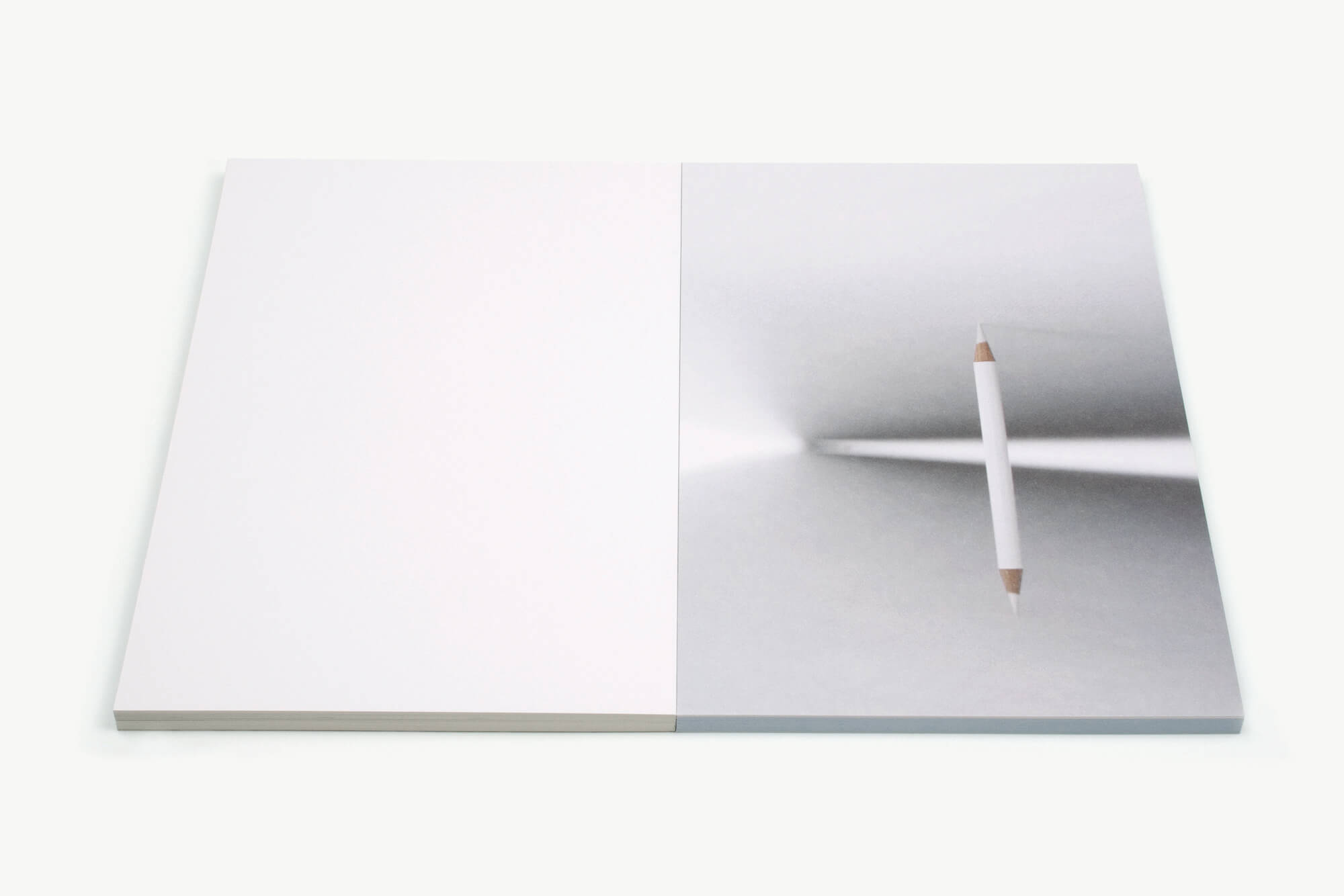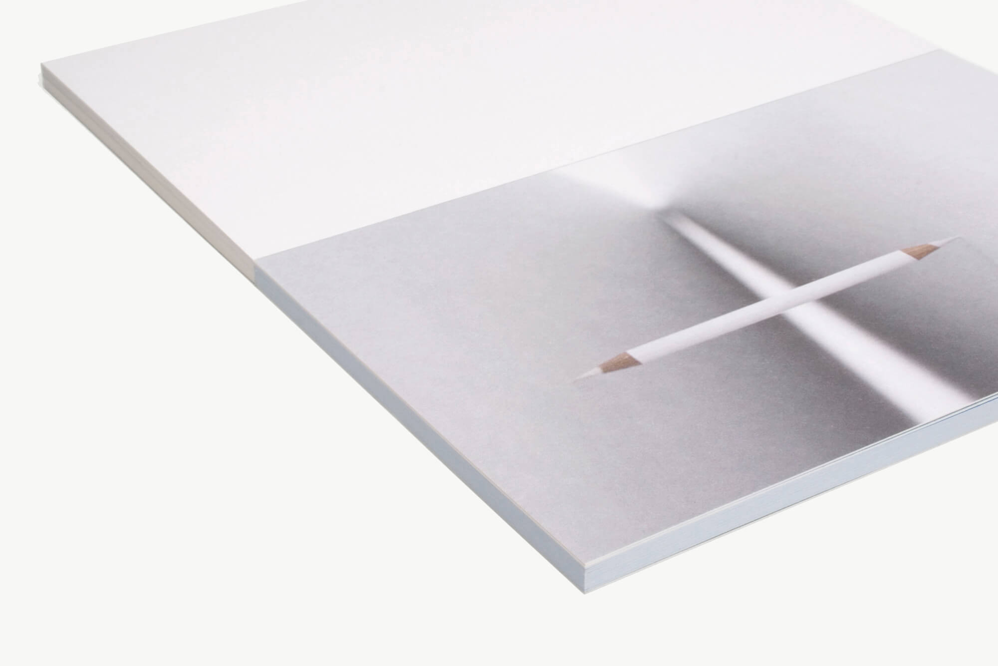 The spine is transparently bound, creating an unusual sculptural quality to the book – particularly when stacked – because the binding is invisible. The book can open completely flat. The same paper is used throughout and is only printed on the top side. When the book is placed upside down all the pages appear blank.