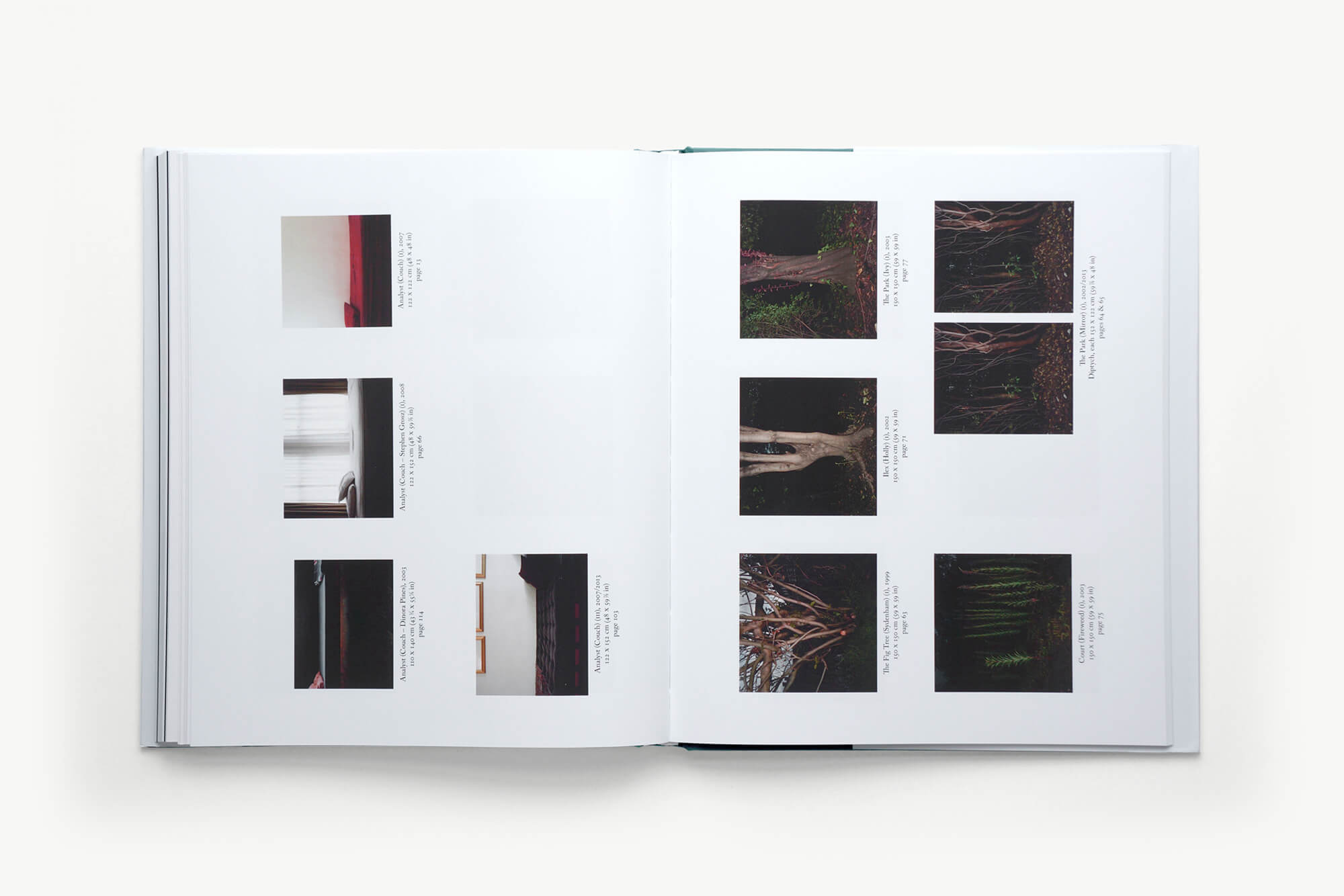 At the end of the book all works are shown at the same scale in relation to one another in a catalogue section. Here all text and images are at 90 degrees to allow increased space for collections to be shown together. This also retrospectively endorses the perpendicularly positioned captions.